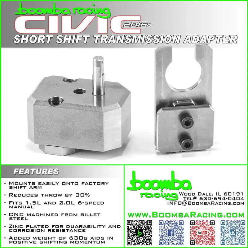 This extremely durable and high-quality adapter installs easily to the existing input bracket on top of your Tenth Gen Civic transmission. No OEM parts need to be removed or modified during the installation process. Once installed, the adapter plate reduces shifter throws by 30%. CNC machined out of billet steel and weighing in at 630g, the increased weight aids in shifting momentum and positive engagement, improving the overall feel of your shifting experience.