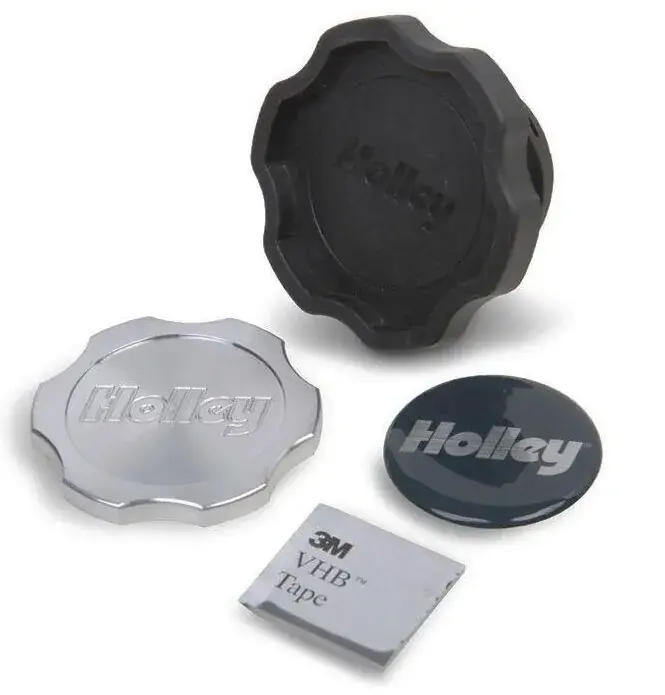 Holley’s new Oil Fill Cap for LS engines removes the oil fill tube that come stock on LS engines and replaces it with a cap. Our cap screws directly into all stock valve covers! The base is made of the same glass-filled material as the factory to ensure durability. Each cap comes with an aluminum insert that can easily be painted before assembly, and a domed Holley decal can be placed on the aluminum insert or directly onto the cap base!