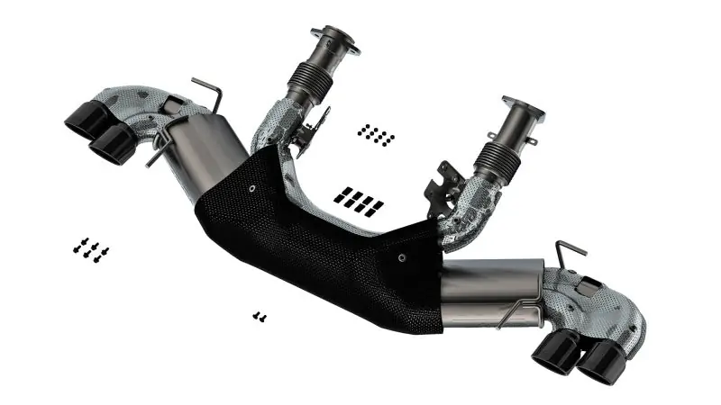 Developing systems for the C8 Corvette presented Borla(r) engineers with unique challenges, but our team was up to the challenge. This 3″ inlet Cat-Back(tm) system includes AFM (’20-’21)/ DFM (’22-’25) valves but does NOT include NPP dual mode exhaust valves. It features the aggressive ATAK(r) sound. It provides a more exciting driving experience without any drone. It contains our Polyphonic Harmonizer and SwitchFire(r) technology. Borla(r) ‘S Polyphonic Harmonizer Technology utilizes patented units that contain pipes of different diameters and lengths to create multiple exhaust notes that harmonize to deliver a clean, rich, full-bodied sound. Completely eliminating the turbulent center intersection of a standard X-Pipe, Borla(r) ‘S patented SwitchFire(r) design truly blends the combustion pulses from both sides of the engine for improved performance and a custom sound. Strategically placed heat shielding is included to prevent exhaust heat damage and protect your Corvette. It comes with 4″ round black chrome on T-304 stainless steel tips and is also available with bright chrome on T-304 stainless steel tips part number 140841, or carbon fiber tips, part number 140841CF. The system is constructed using T-304 stainless steel and is backed by our Million Mile Warranty. System ships in 2 boxes. Note: After installation of the Borla(r) system, the controllers for the AFM/ DFM valves in the exhaust system should be RE-CALIBRATED according to GM Document ID 5406413. Borla(r) recommends taking your car to the nearest Chevrolet dealer for the recalibration service. System Features: Cat-Back(tm) Exhaust System Includes AFM/ DFM valves Does NOT include NPP Valves ATAK(r) Sound Level SwitchFire(r) Technology Heat Shielding 4″ Round Black Chrome On T-304 Stainless Steel Tips T-304 Stainless Steel Construction Million Mile Warranty